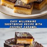 This Millionaire Shortbread recipe features a buttery shortbread base topped with a rich caramel layer made from condensed coconut milk, and finished with a smooth dark chocolate topping. It offers a delightful combination of textures and flavors, perfect for a decadent dessert treat.