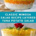 Mimosa Salad is a delicious layered tuna salad featuring a colorful combination of boiled potatoes, carrots, hard boiled eggs, and tuna, all brought together with creamy mayonnaise and a touch of olive oil. This traditional Russian-inspired salad is perfect for gatherings, offering a balanced mix of textures and flavors with a beautiful presentation.