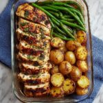 This One-Pan Garlic Herb Chicken with Crispy Potatoes & Green Beans is a simple, flavorful sheet pan meal perfect for busy weeknights. Tender chicken breasts are coated in a savory blend of garlic, paprika, and oregano, then baked alongside crispy rosemary potatoes and fresh green beans for a complete and nutritious dinner with minimal cleanup.