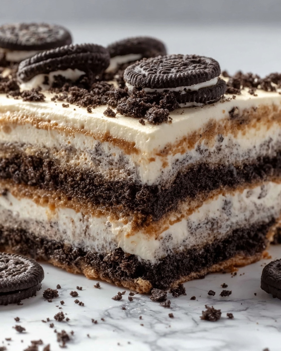 This Oreo Lasagna is a decadent layered dessert featuring a crushed Oreo cookie crust, a creamy whipped cream and cream cheese layer, smooth vanilla pudding, and a topping of crushed Oreos. Perfectly chilled for hours to meld flavors, it is an indulgent no-bake treat ideal for parties and special occasions.