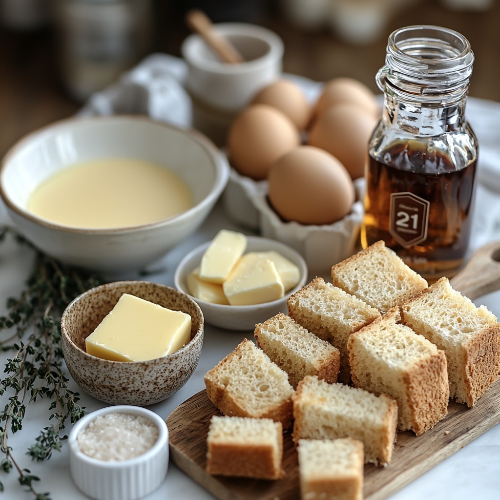 Gathering fresh, straightforward ingredients is the key to nailing this recipe. Each component plays a distinct role, from creating the golden caramel base to soaking the bread in a perfectly spiced custard that bakes into a soft, fluffy delight.