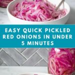 Quick Pickled Red Onions are a simple and vibrant condiment perfect for adding a tangy crunch to sandwiches, salads, tacos, and more. This easy recipe requires just a few ingredients and takes only minutes to prepare, with no cooking involved. The onions develop the best flavor after marinating in red wine vinegar and salt for a couple of hours, making it a versatile and quick pickling method.