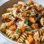 A delicious and hearty roasted butternut squash and sun-dried tomato chicken pasta recipe that combines tender roasted squash, flavorful chicken, and a creamy Parmesan sauce for a perfect comforting meal.
