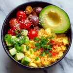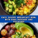 A wholesome and flavorful savory breakfast bowl featuring fluffy scrambled eggs, creamy avocado slices, crispy roasted baby potatoes, and fresh cherry tomatoes. Perfect for a nutritious and satisfying morning meal.