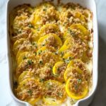 Remove from the oven and let your casserole cool for a few minutes. Serving it warm allows the flavors to meld beautifully while preserving that delightful texture contrast between creamy squash and crunchy topping.