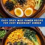 This Spicy Miso Homemade Ramen recipe delivers a flavorful, warming bowl of ramen broth infused with miso and Korean chili paste. It’s loaded with fresh vegetables, tender ramen noodles, and soft-boiled eggs, making it a perfect comfort meal with a spicy kick. The combination of sesame and vegetable oils, garlic, and ginger adds a robust depth to the broth, complemented by toppings like corn, bok choy, mushrooms, and nori for a satisfying and delicious experience.