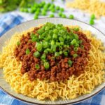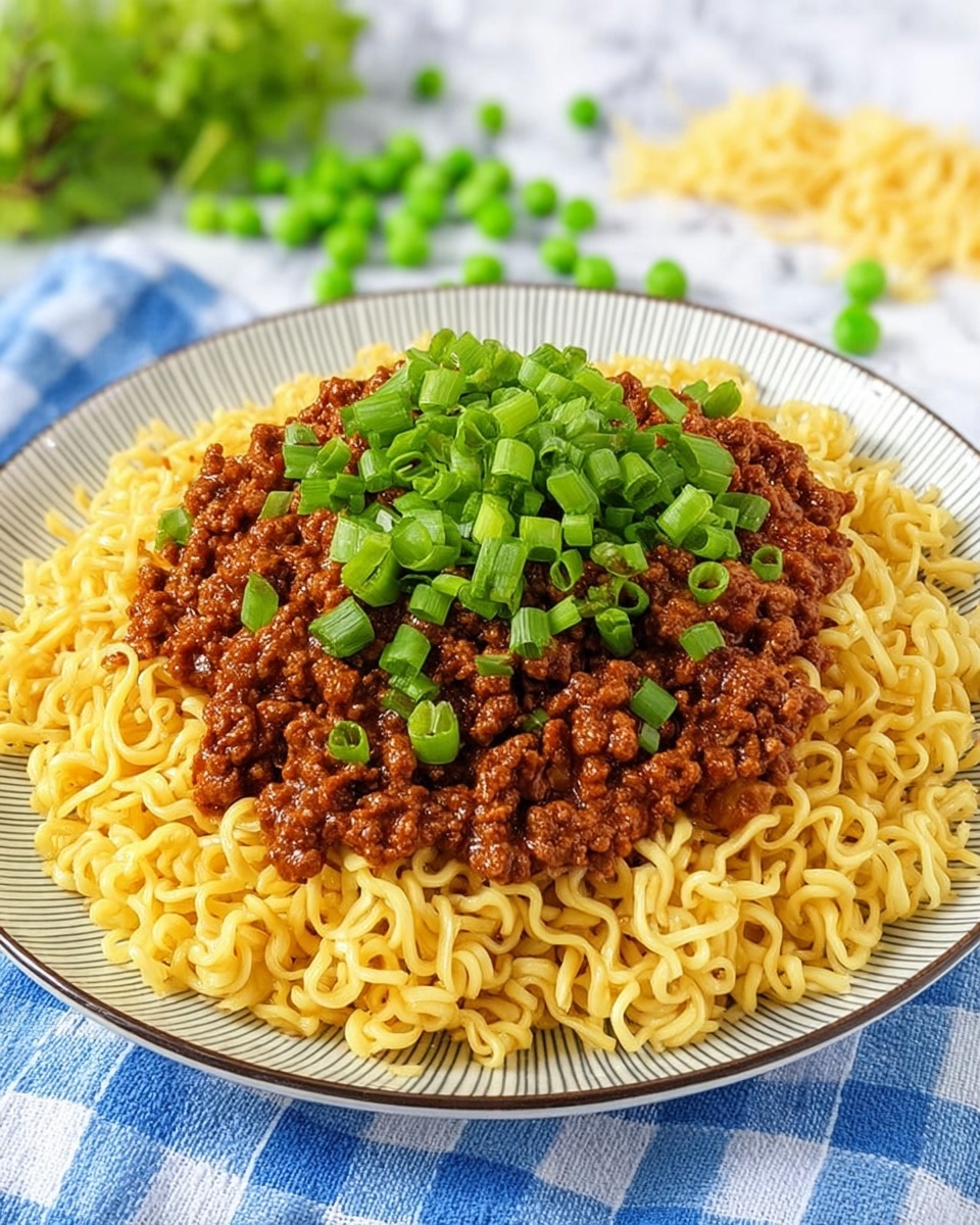 Now the fun part: in your serving bowls, place a bed of your cooked ramen noodles. Ladle some of the warm broth over the noodles to soak in all that goodness. Next, spoon a generous amount of the taco meat and veggie mixture over the top, letting the colors and textures blend invitingly.