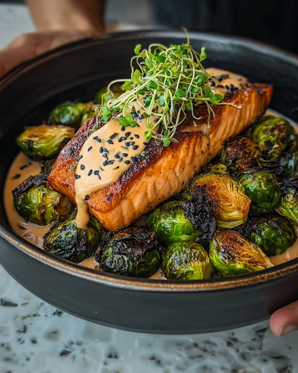 This recipe calls for straightforward ingredients that you might already have in your pantry and fridge. Each component plays an important role: from the juicy salmon that provides tender protein to the vibrant Brussels sprouts that bring a satisfying crisp and earthiness, plus bright accents that elevate the bowl visually and flavor-wise.