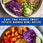 This vibrant Thai Peanut Sweet Potato Buddha Bowl combines roasted sweet potatoes, fluffy quinoa, sautéed edamame and bell peppers, fresh cucumber and cabbage, all drizzled with a creamy, tangy Thai peanut sauce. Garnished with roasted peanuts, fresh cilantro, and lime wedges, this wholesome and colorful bowl is packed with nutrients and bold flavors perfect for a healthy, satisfying meal.