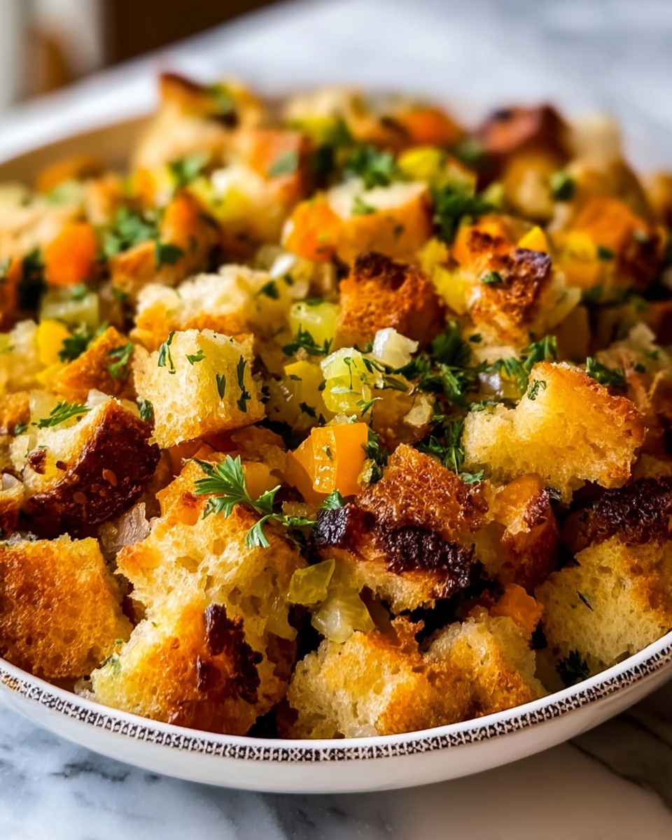 Yes! You can assemble the stuffing a day ahead, cover it tightly, and refrigerate. When you’re ready, bake it covered longer to ensure it’s heated through and finishes with a crispy top.