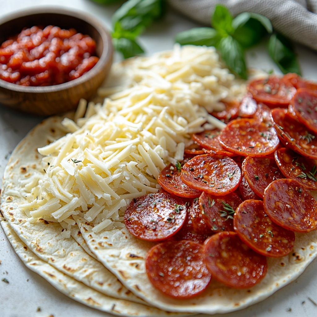 - Add Sauce and Cheese: Spread pizza sauce evenly over the tortilla, then sprinkle shredded cheese on top, followed by your preferred toppings like chopped pepperoni.