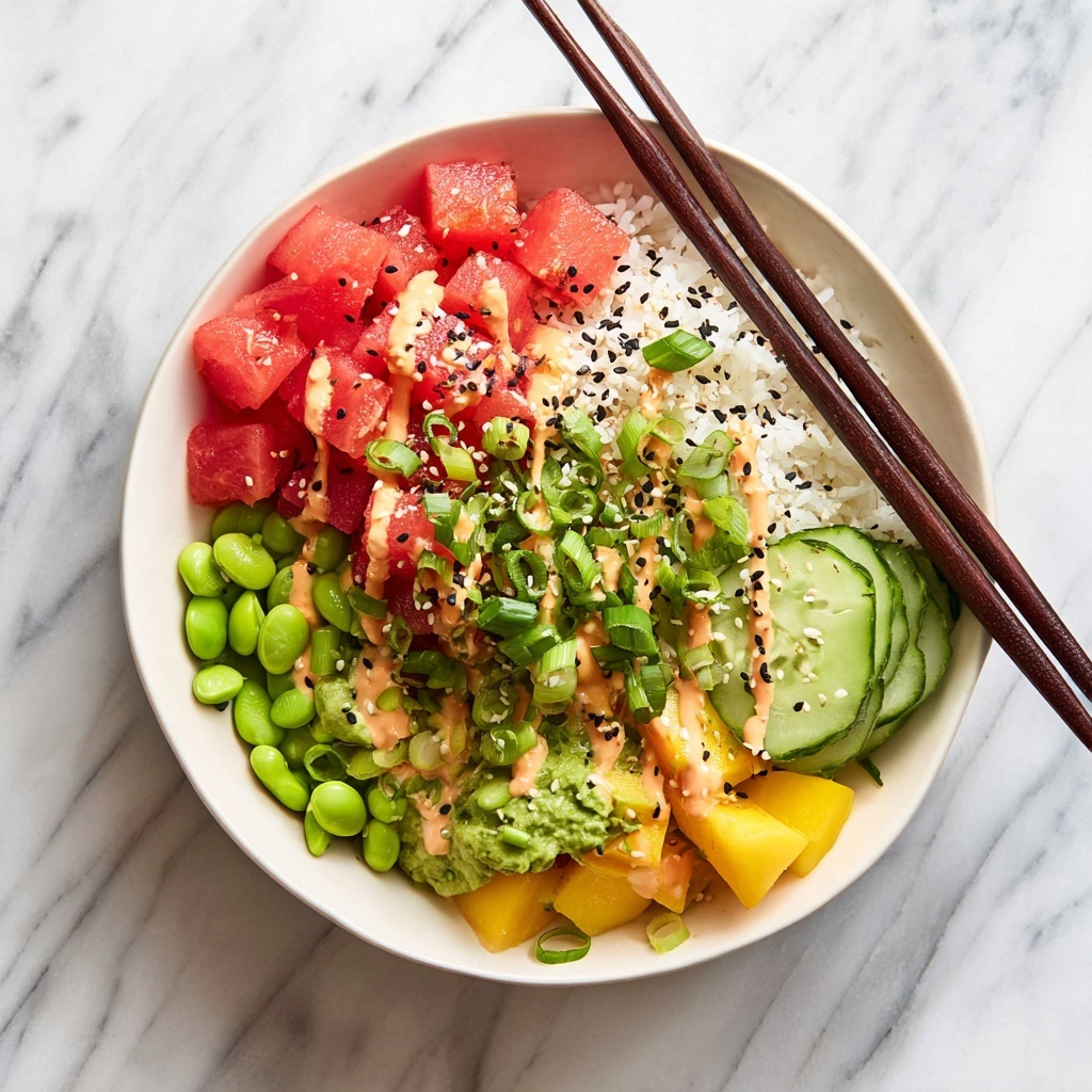 For an eye-catching presentation, arrange the toppings in neat color-blocked sections or in concentric circles atop the rice. Serving the spicy mayo on the side allows guests to control the heat, making this Watermelon Poke Bowl Recipe perfect for sharing at casual gatherings or weeknight dinners.