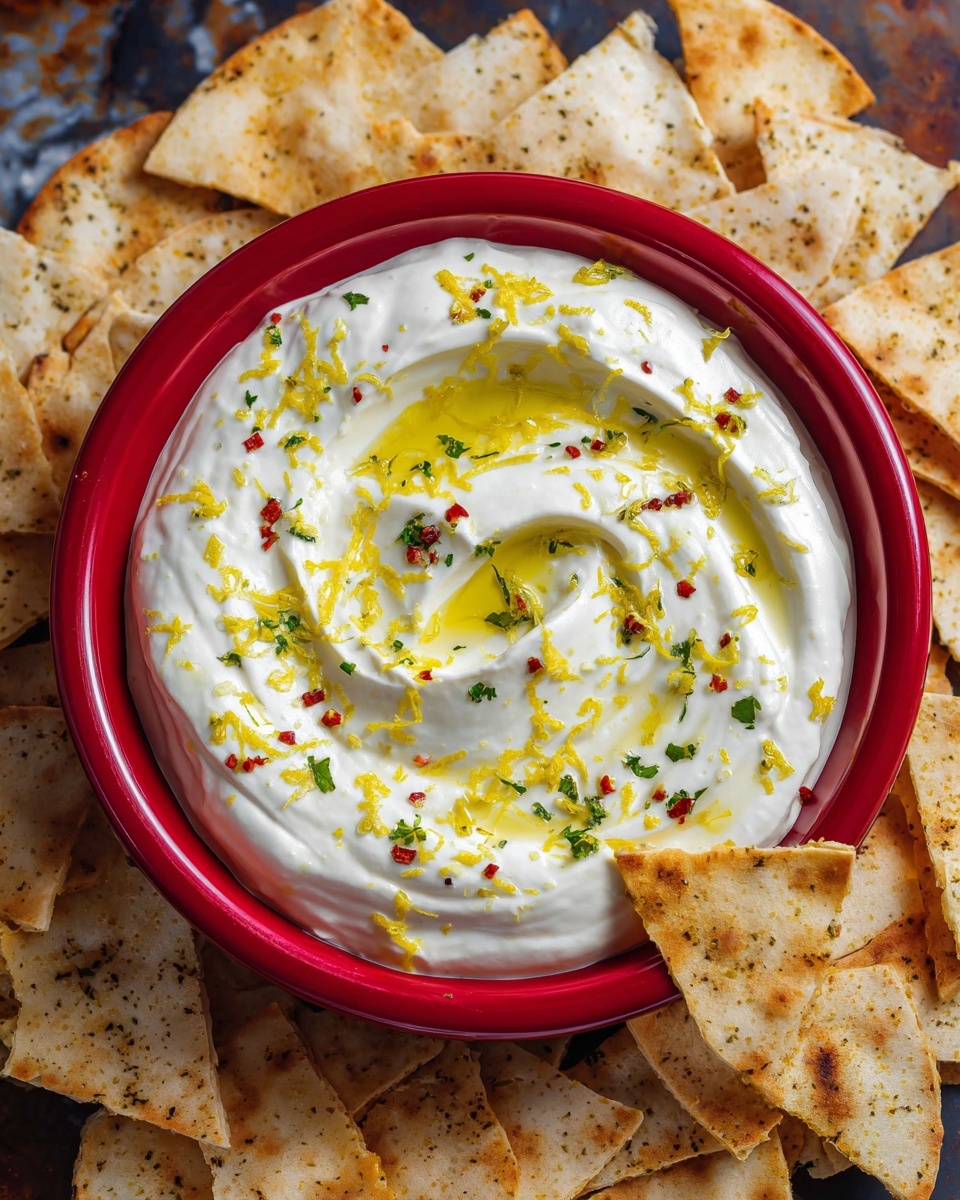 Once your dip is silky and whipped to perfection, spoon it into a shallow serving bowl. Use the back of a spoon to create gentle swirling grooves on the surface – this not only looks inviting but also creates perfect nooks for the toppings to cling to. Drizzle generously with extra virgin olive oil, then sprinkle on crushed red pepper flakes, finely chopped parsley, more lemon zest, and freshly cracked black pepper. These garnishes add vibrant color, freshness, and layers of flavor that make this dip truly special.
