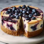 A luscious White Chocolate Blueberry Cheesecake featuring a creamy marbled filling of melted white chocolate and fresh blueberry puree on a buttery graham cracker crust. This elegant dessert combines the sweetness of white chocolate with the tartness of blueberries, perfect for special occasions or indulgent everyday treats.